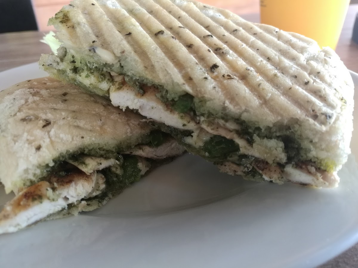 Triple-decker sandwich with smoked farmer's ham and grilled rosemary chicken on sliced focaccia loaf bread.